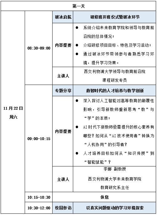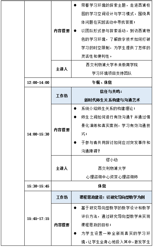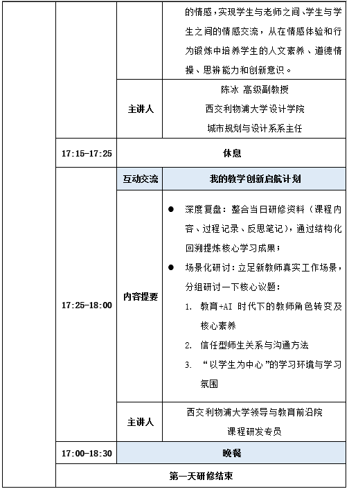 互动交流学以致用:通过工作坊深度实操、西浦创新校园环境的沉浸式参访,并最终以个人《教学创新启航计划》的制定与分享作为终点,确保每位新教师带着可落地的方案回归教学岗位,完成从理念到行动的完整闭环。