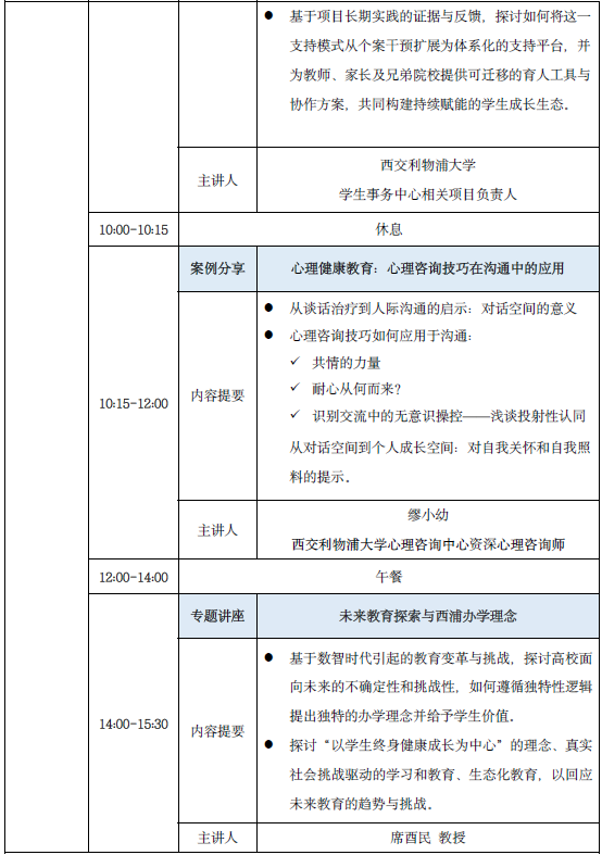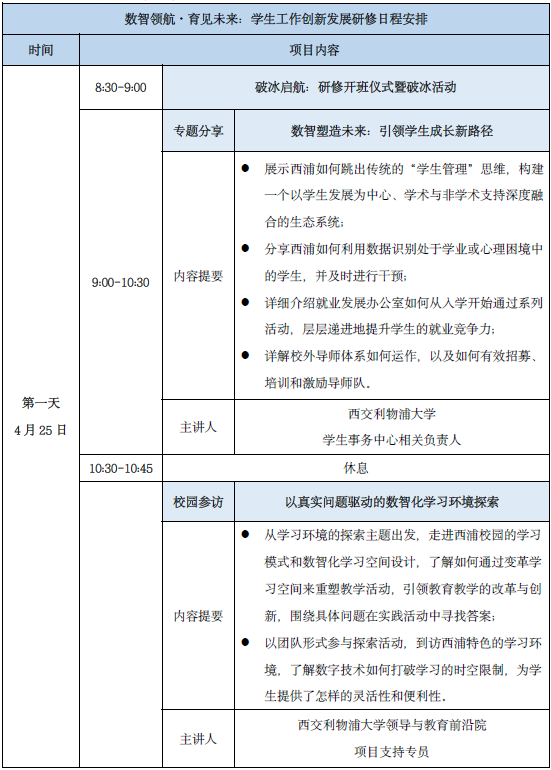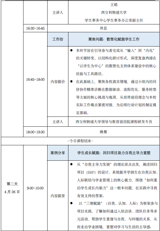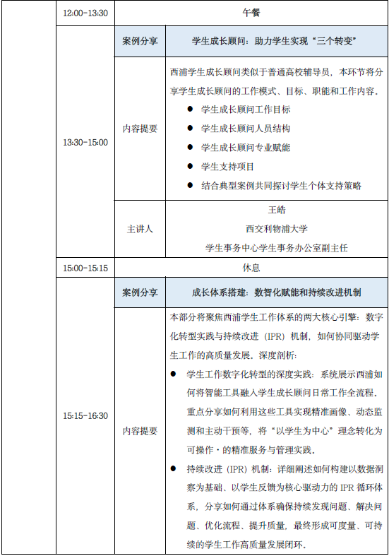 引导参与者基于本校学生工作实际,梳理数智化转型过程中的核心挑战,借鉴西浦案例,以同侪协作、互助研讨的形式,联合制定针对性解决方案,推动跨校深度交流、经验互鉴与合力共创,切实将研修成果转化为推动本校学生工作数智化升级的实际动力。