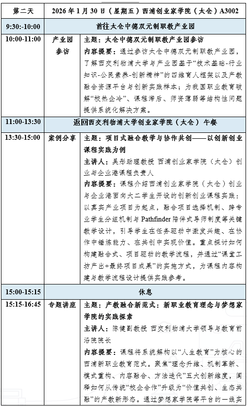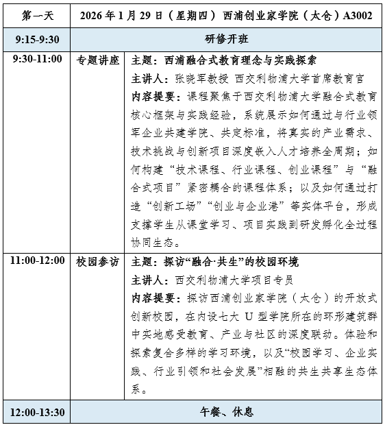 本次研修以西浦创业家学院(太仓)的融合式教育创新实践为依托,聚焦职业教育产教融合深化的核心挑战,主要解决以下问题: